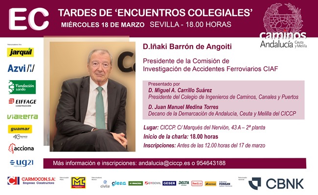 La Demarcación de Andalucía, Ceuta y Melilla del Colegio de Ingenieros de Caminos, Canales y Puertos celebra el próximo Encuentro colegial con el presidente de la Comisión de Investigación de Accidentes Ferroviarios (CIAF), Ignacio M. Barrón de Angoiti (Colg. 7752). Centrará su charla en la investigación de accidentes ferroviarios, poniendo como ejemplo la vigente en Adamuz (Córdoba).