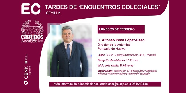 La Demarcación de Andalucía, Ceuta y Melilla del Colegio de Ingenieros de Caminos, Canales y Puertos celebra el próximo Encuentro colegial con el director de la Autoridad Portuaria de Huelva, D. Alfonso Peña López-Pazo (Colg. 20158), que hará una radiografía de las actuaciones en el puerto.