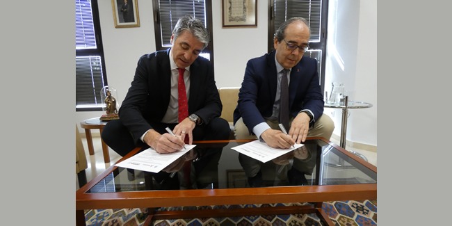 La cooperación entre la Escuela Técnica Superior de Ingeniería de Sevilla y la Demarcación de Andalucía, Ceuta y Melilla del Colegio de Ingenieros de Caminos, Canales y Puertos se ha formalizado con un nuevo convenio en el que sustentan su compromiso con el fomento de la Ingeniería de Caminos, Canales y Puertos. El Decano de Caminos Andalucía, Juan Manuel Medina Torres, y el Director de la ETSI de Sevilla, Andrés Sáez Pérez, firmaron el 24 de febrero un acuerdo que canaliza la colaboración de ambas entidades en acciones concretas como el Concurso de Puentes Agustín de Betancourt, dirigido a los estudiantes de Grado y Máster; o la celebración de las Olimpiadas Nacionales de Ingeniería, con las que se busca captar nuevas vocaciones entre los jóvenes de los institutos andaluces.