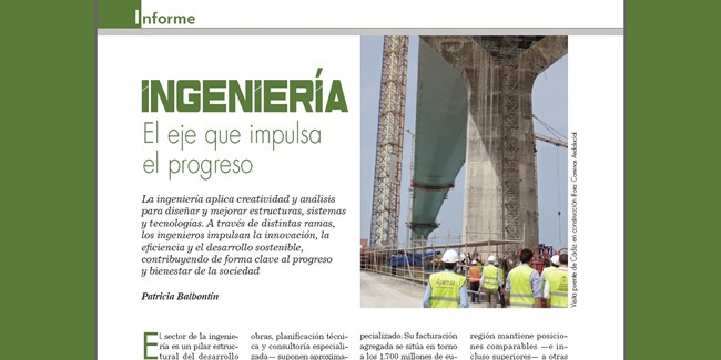 La revista Andalucía Económica ha publicado en su edición de febrero de 2026 el reportaje titulado “El eje que impulsa el progreso”, firmado por Patricia Balbontín, en el que se analiza la relevancia estructural del sector de la ingeniería en el desarrollo económico andaluz. El artículo subraya cómo la ingeniería transforma conocimiento en infraestructuras, energía, industria y soluciones digitales, consolidándose como un pilar clave para la competitividad y el bienestar social.