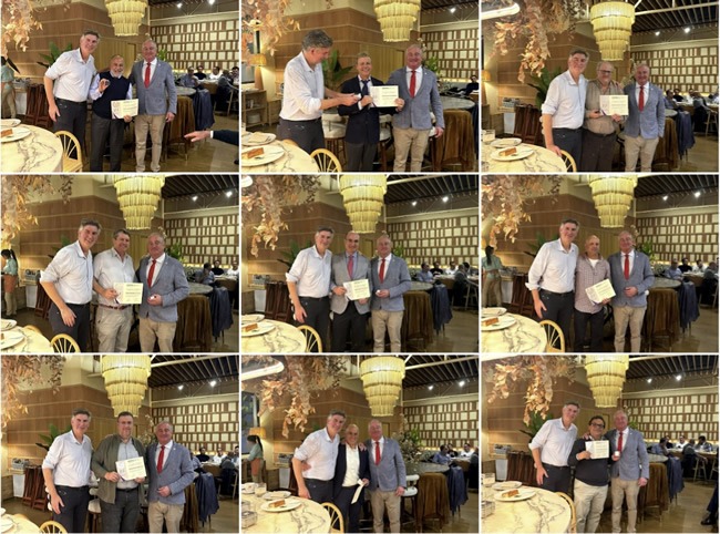 El encuentro, como cada año, fue el escenario de la entrega de las distinciones por los 25 y 50 años de colegiación a una docena de compañeros que este 2025 cumplían sus bodas de plata y oro en el Colegio. El vocal de la Junta Rectora de la Demarcación de Andalucía, Ceuta y Melilla Alejandro Castillo Linares asistió al representante en la entrega de los pines conmemorativos, medallas y diplomas por tantos años de compromiso colegial, de desempeño al servicio de la sociedad y de entrega callada a una profesión que deja huella en el bienestar de la ciudadanía y en su día a día. Padilla Jiménez quiso hacer oficialmente entrega también de sus reconocimientos a los colegiados que en 2024 no pudieron estar en su entrega.